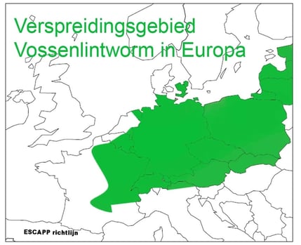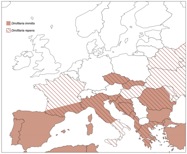 Verspreidingsgebied van Hartworm (Dirofilaria) in Europa (bron ESCCAP)